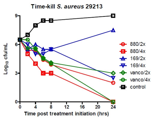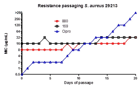 Thirty-eight of these compounds were selected based on an acceptable IC50 concentration and tested in a bacterial assay where eight compounds demonstrated activity against two or more strains of S. aureus. Strains tested included MRSA strains, vancomycin resistant strains and MDR strains. The two most active hits were further characterized to establish a true antibiotic effect.